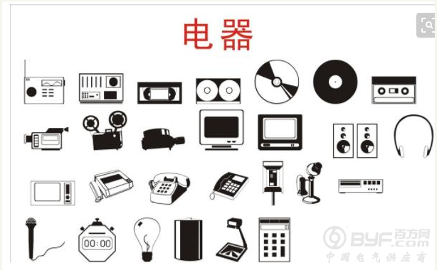 泛指所有用电的器具,比如:电视机、电冰箱、风扇、电脑…………从专业角度上来讲,主要指用于对电路进行接通、分断,对电路参数进行变换,以实现对电路或用电设备的控制、调节、切换、检测和保护等作用的电工装置、设备和元件。