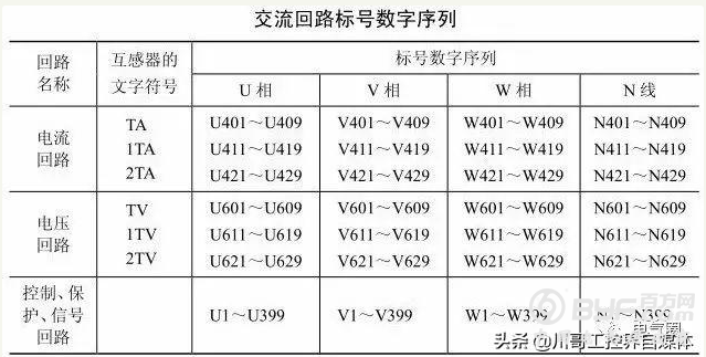 当需要表示相序时,可在数字前冠以相别字母,新标准用U、V、W、N。常用交流回路标号数字序列见下表。