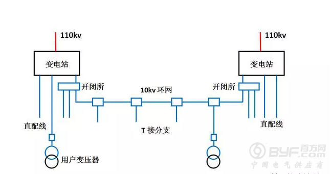 该系统有两个变电站,各出一路分支通过开闭所组成一个闭环供电网络;环网采用开环供电方式,具体由两侧的开闭所实现开环和供电的主、备用控制;环网中可有若干个T接线路为用户供电。同时,两个变电所分别可有若干个直配分支线路为专线用户供电。