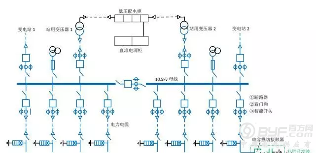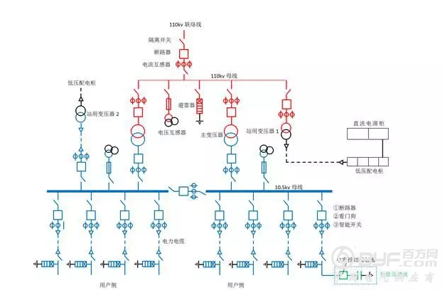 包括:①交流系统——低压配电柜,用于提供直流系统、交流电动机及照明电源;②直流系统——直流电源柜及电池组,用于二次系统、直流驱动及事故照明。