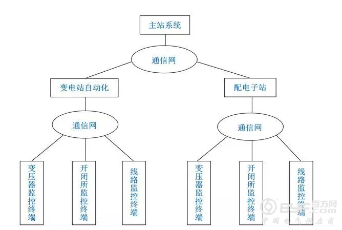 配电网监控与采信系统(SCADA)由主站、通信网络和各种现场监控终端组成,如下图所示。