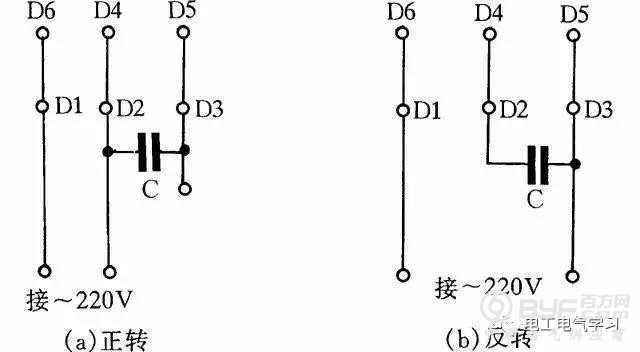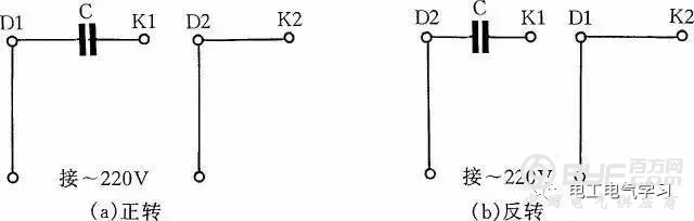 图4是JX07A-4型单相电容运转电动机接线方法。电动机功率为60W,用220V/50Hz交流电源、电流为0.5A。它的转速为每分钟1400转。电容选用耐压400~500V、容量8μF的产品。图4(a)为正转接线,图4(b)为反转接线。