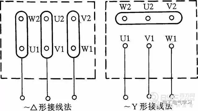 图1 三相交流电动机Y形和△形接线方法