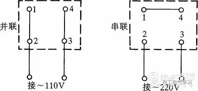 有的单相吹风机引出4个接线端子,接线方法如图5所示。采用并联接法应接入110V交流电源,采用串联接法应接入220V交流电源。