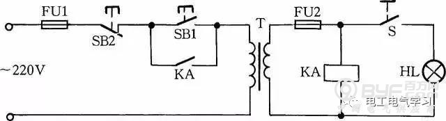 工作原理:闭合S后,按下按钮SB1,变压器得电输出36V低电压,使得继电器或交流接触器KA吸合。放松按钮SB1后,KA自锁触点使KA保持吸合,继续给变压器接通电源。如果变压器次级发生短路故障,继电器线圈电压为零,此时KA便失电释放,将变压器电源断开,保护变压器不被破坏。