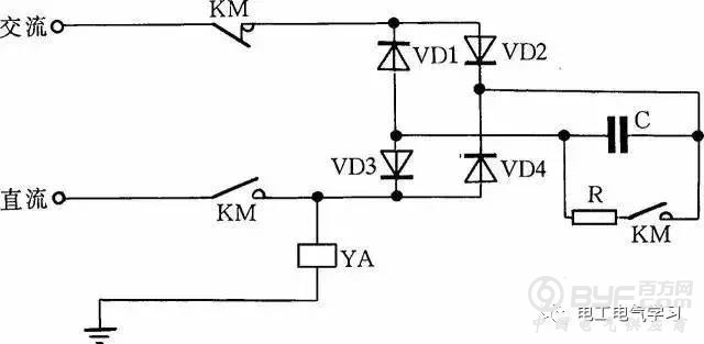 直流电磁铁停电后,因有剩磁存在,有时会造成不良后果。因此,必须设法消除剩磁。图9中,YA是直流电磁铁线圈,KM是控制YA启停的接触器。KM吸合时,YA通电励磁;KM复位时,YA断直流电,并进行快速退磁。