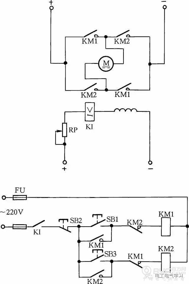 在励磁电路内,串联一个欠电流继电器KI,其常开触点接在控制电路中。当励磁电流消失或减小到设定值时,KI释放,KI常开触点断开,切断电动机电枢电源,使电动机停转,从而避免超速现象发生,见图11。