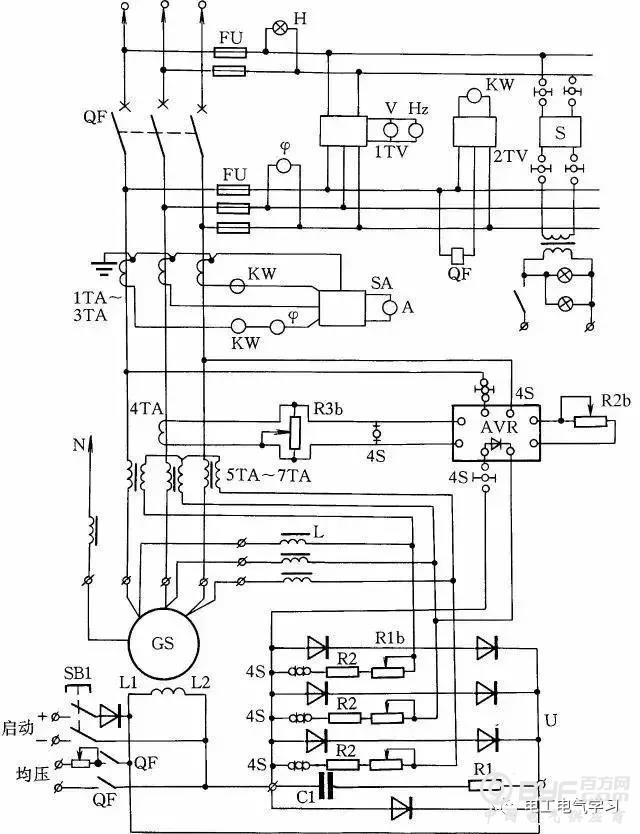 HF-4-81系列发电机控制线路如图15所示,它与T2XV系列小型三相同步发电机配套。同步发电机的励磁系统采用电复合相复励调压。发电机端电压经线性电抗器L移相,然后与发电机负荷电路中的电流互感器5TA~7TA二次电压合成,经三相桥式整流器整流后,供发电机GS励磁自动调压。