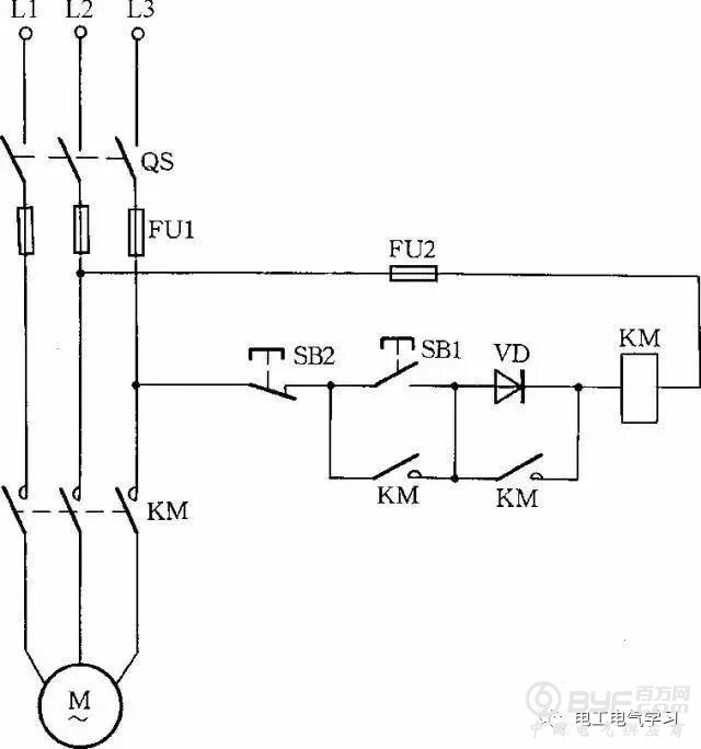 因为启动电流较大,所以这种线路只适用于操作不频繁的场合。线路中,VD应选用耐压大于700V的二极管,电流要根据交流接触器线圈电流而定。