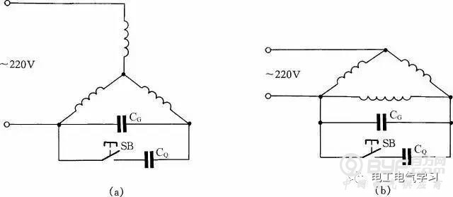 如图19所示:图(a)为Y形接法电动机连接方法,图(b)为△形接法电动机连接方法。为了提高启动转矩,将启动电容CQ在启动时接入线路中,在启动完毕后退出。