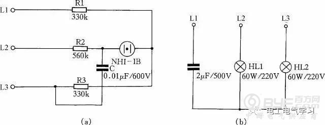 用电阻、电容、氖泡可组成一小型电源相序指示器。当电源按顺相序L1、L2、L3接入时,氖灯就亮;按逆相序L2、L1、L3接入时则氖灯不亮。线路如图25(a)所示。