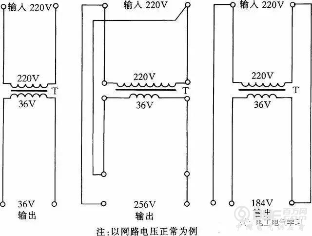 采用此法应注意两点:一是在接线前必须把行灯变压器次级一端与壳体的连接线(保护接地线)拆除;二是要注意行灯变压器的初、次级绕组的电流都不能超过各自的额定电流值。