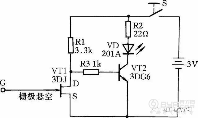 图28所示是一感应测电笔线路。它可方便地测出导线的断芯位置。在用来测导线断芯位置时,在导线一端接上220V的电源相线,然后用感应测电笔的探头栅极靠近被测导线,并沿线移动。如果发光二极管在移动中突然熄灭,那么此处便是导线断芯位置。