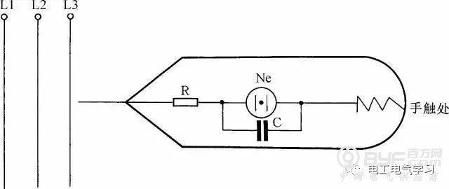 在测验三相交流电时,如果带电的线路较长,即使三相交流电缺一相电源,用一般的验电笔测试也很难判断出是哪根电线缺相(因为线路较长,并行的线与线之间产生的电容容量增大,使不带电的某一根电线产生感应电)。为了快速、准确地判断,可在一般的低压验电笔的氖泡上并联一只1500pF小电容,这样在测强电时,电笔照常发光。而测得的是感应电时,感应电会通过电容再经过人体被大地吸收掉,所以电笔不发光。在自制这种验电笔时应把电笔上串联的保护电阻放在测电笔线路的最前端以保障安全,见图36。