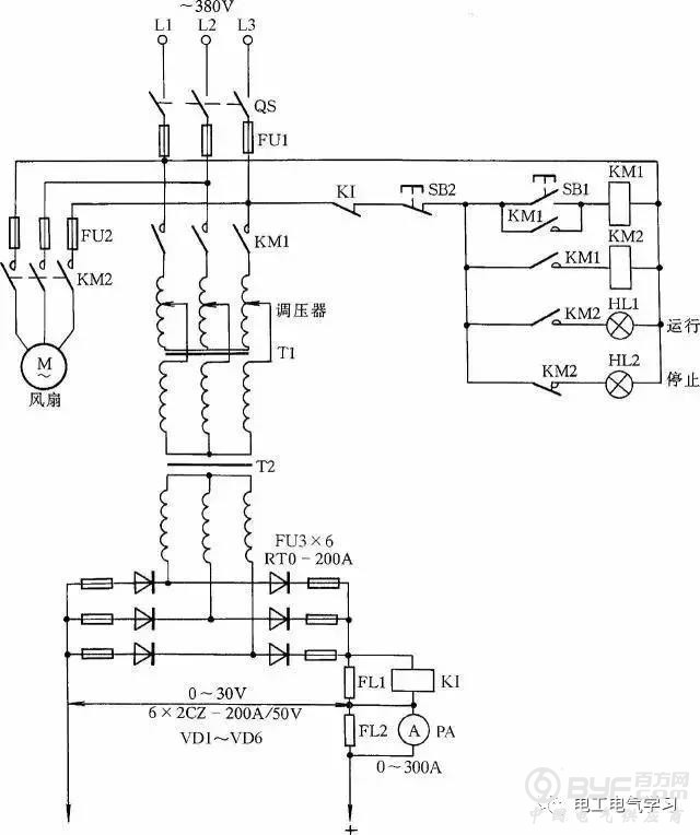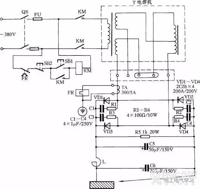 电路中VD1 ~ VD4 为4 只硅整流二极管;R1 ~ R4、C1 ~ C4组成硅整流器件的过压保护电路;FR 为过流继电器,保护硅整流器件。当负载电流超过额定值时,电流互感器次级电流相应增加,带动继电器FR 动作,FR 常闭触点打开,接触器KM 释放,触点打开切断电焊机电源。硅整流器件用0. 25kW 风扇作风冷设备。图中,C5 为滤波电容,R5 为泄放电阻。