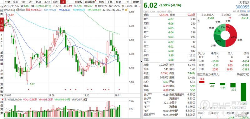 公司今日股价下挫2.59%至6.02元,最新总市值为52亿元,最新成交额为6669万元。