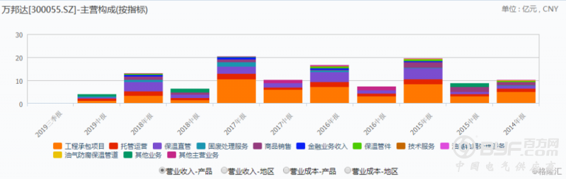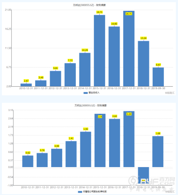 值得一提的是,根据公司日前披露的前三季度报表,万邦达的营收、净利增速再度下滑,2019年1-9月公司实现营业收入6.67亿元,同比下降39%,归母净利润1.68亿元,同比下降30.07%,其中,第三季度实现营业收入2.57亿元,同比下降42.87%,归母净利润5181万元,同比下降37.4%。公司称,前三季度净利下滑主要是受新签工程项目较少以及宁夏子分公司托管运营类项目检维修成本提高所致。
