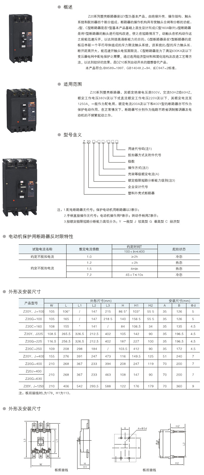 DZ20系列断路器其额定绝缘电压为660V,交流50Hz或60Hz,额定工作电压380V及以下,额定电流至2000A,一般作为配电用,额定电流225A及以下和400Y型的断路器亦可作为保护电动机用。在正常情况下,断路器可分别作为线路不频繁转换及电动机的不频繁起动之用。