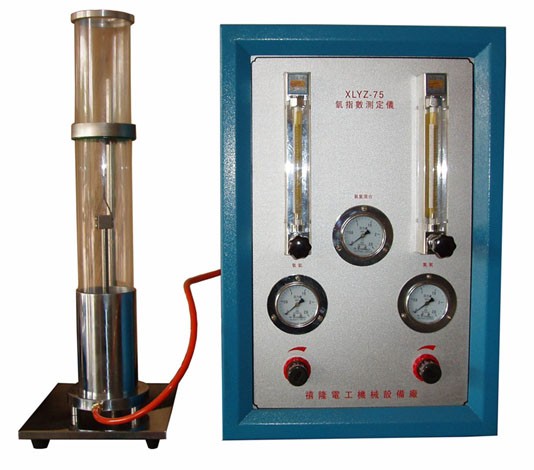 本试验机是在国家标准GB/T 2406-93规定的技术条件下研制地一种新型的阻燃材料测试设备。该仪器是用来测试聚合物在燃烧过程中所需氧气的浓度(体积的百分比),聚合物的氧指数值是在物质引燃后,能保持燃烧50mm或燃烧时间为3min时所需氧氮混合气体中最低氧气的体积百分比浓度。