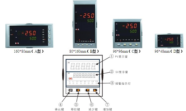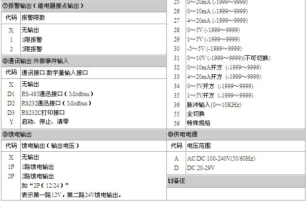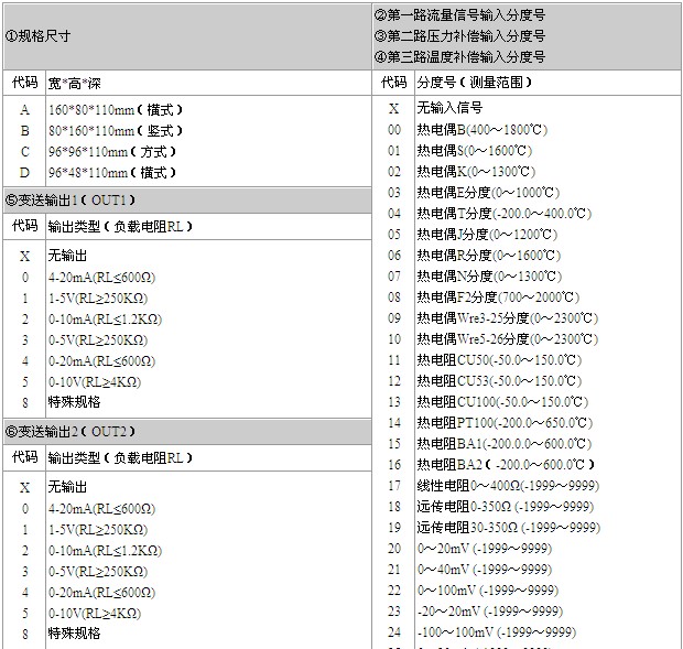 备注: 1、选型中③、④项输入分度号选择“X”无输入分度号时,表示无补偿流量积算控制仪。