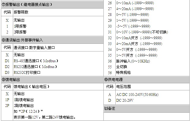 备注: 1、选型时请根据接线图来选择功能,由于尺寸小的仪表接线端子少带不了全功能,有的功能在同组端子上只能选择其中一种功能。