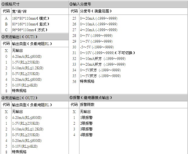 备注: 1、选型时请根据接线图来选择功能,由于尺寸小的仪表接线端子少带不了全功能,有的功能在同组端子上只能选择其中一种功能。