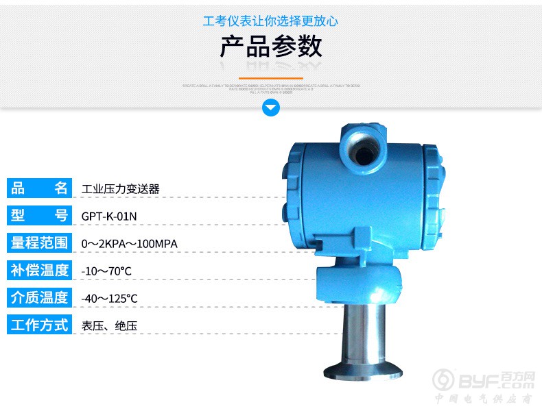 GPT-K-02W系列平面膜结构压力变送器采用平面膜直接感受压力。传感器接口有卡箍式,M27×2,法兰式可供选择。输出信号有电压、电流、频率信号等可选择,传感器平膜片防止了结垢,不卫生及粘稠液体堵塞等问题。广泛应用于、医药、卫生及酿酒工业等部门。