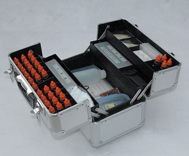 该箱用于文件检验,其内容包含了多种物理和化学检验方法。可以进行纸张上书写压痕的检验,不
