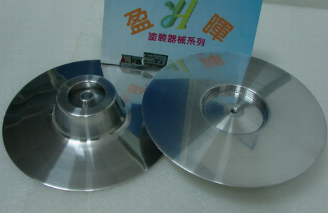 DISK静电雾化盘 旋碟(定制雾化盘) 旋碟雾化盘是欧米茄静电自动喷漆机器主要部件,承担涂料雾化功能,涂层均匀及雾化颗粒大小省油有直接关连。静电雾化盘安装在气动高速马达连接端,涂料由泵浦定量输送到盘内壁再经过高速离心旋转往盘的底部小孔甩出形成雾状微小颗;雾状涂料带有负极静电迅速吸附到带正极工件(接地正极);完成静电喷漆涂层作业。 盈晖旋碟雾化盘材质为高密度铝合金,表面特殊处理,光亮耐腐蚀,转速可达到30000r/min,符合高速平衡转动要求。规格:φ170mm φ200mm φ220mm φ250mm 。(可按客户要求定制)广泛应用于:金属或木制门窗、楼梯扶手、电子、厨具、藤具、机车、自行车、电动车、汽车、家电、电镀喷油、植绒、小五金、乐器、建筑装饰材料等DISK静电喷漆行业。 感谢您对我们的支持!如需对产品更多了解请致电盈晖,我们将以专业的技术支持和热情的服务为您提供专业的免费咨询。联络方式:13602952497、0758-2702681、传真:0758-2702680、QQ:657834923、贸易通:luguoheng97、E-mail;luguoheng97@163.com 卢先生。