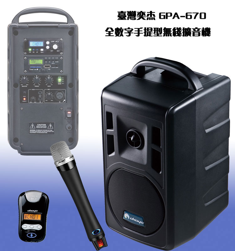 台湾OKAYO奕杰电子股份有限公司成立于台湾台中市,专业生产专业数字无线扩音机,语音导览系统, UHF无线麦克风以及UHF无线声场系统,德国TUV Rheinland质量管理系统认证企业。产品主出口德国、美国,英国等欧美国家。最新推出全数字手提式无线扩音机GPA-670,轻巧,便携,省电,5” 铷铁A喇叭加1”高音喇叭,立体声强劲清晰,达到最佳的声场效果。可固定驾设在室内或户外郊游活动,功能齐全和帖心的人性化设计,是领导视察、企业参观解说,中小培训扩音最为便利的设备。