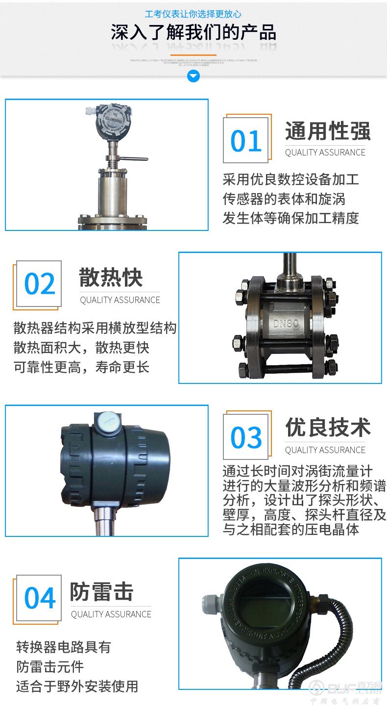 采用先进数控设备加工传感器的表体和旋涡发生体等,确保加工精度,从而使零部件(特别是旋涡发生体)的通用性强,从而真正做到不会因零部件的更换而影响传感器的重复性和精度;能产生强大而稳定的涡街信号;