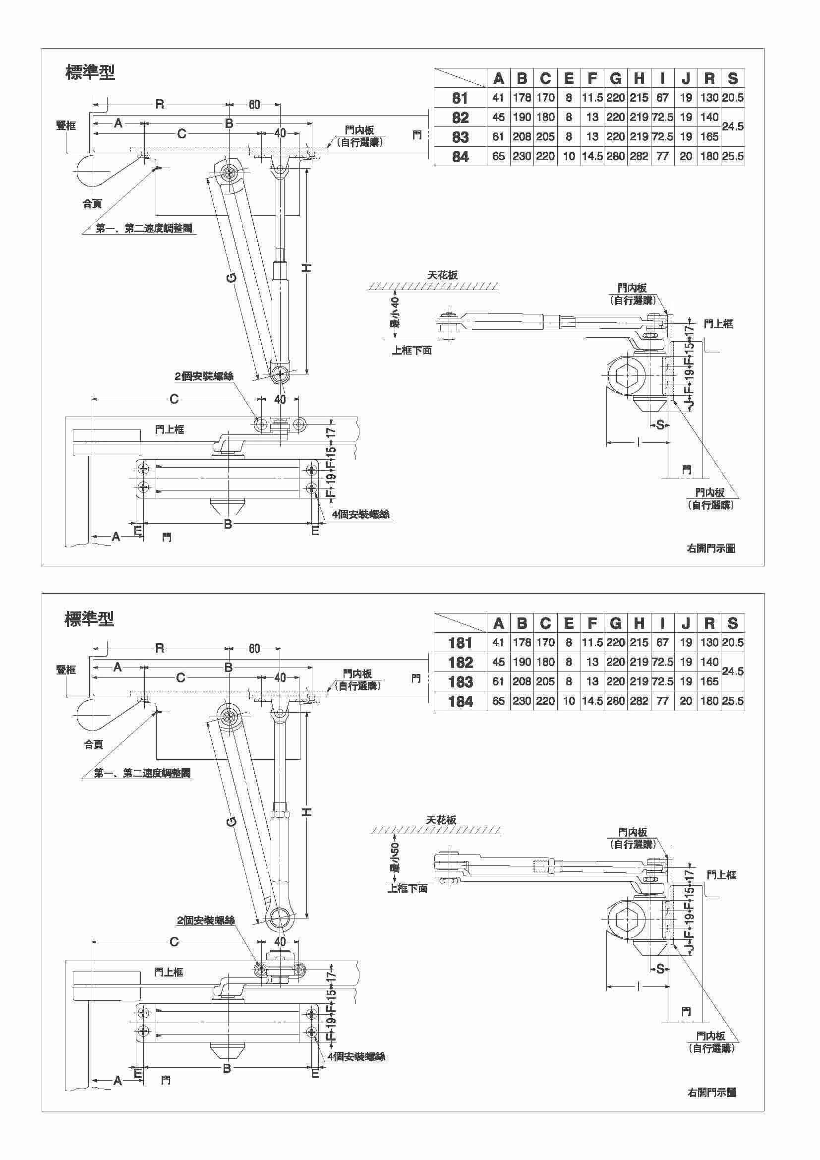 3、除185和186以外无左右之分,只要将闭门器本体上下颠倒安装,即可左右开兼用。