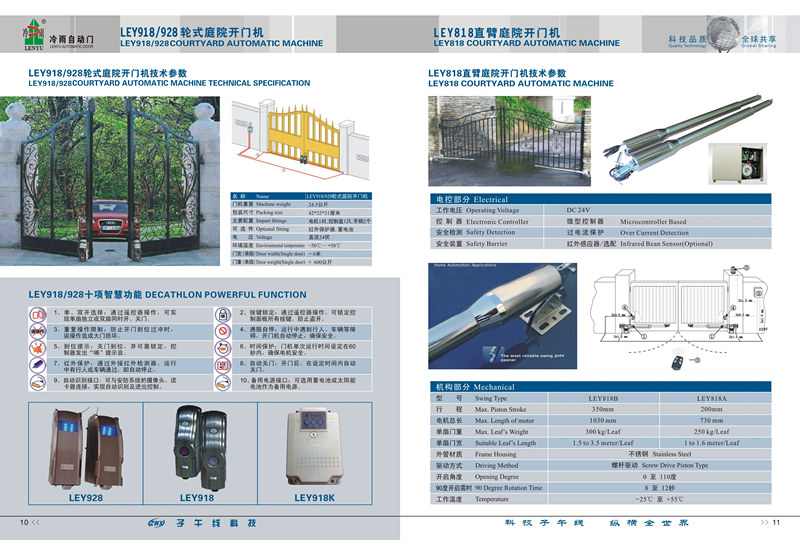 子午线新一代智能遥控开门机ZWX600 / LEY860 智慧型,适用于各种铁艺门、别墅门、庭院门的遥控/自动启闭。其人性化设计极为科学、合理,与传统的埋地式、臂挂式平开门机相比,有着无可比拟的优越性。获得中华人民共和国知识产权局多项专利。 平开自动门、遥控大门、电动大门、大门等的最佳选择,创造性的产品设计、精良的制作工艺、专业的服务,完美地将高端技术和现代生活风范融于一体,充分满足都市尊贵生活的要求,创新科技,时尚之选!
