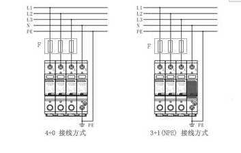 从电源开开联线到保护,还从电源开关联线到负载端。这种方法适用于负载电流100A以上的配电箱。联接到保护器的导线截面不受负载电流的影响,但长度不得过500mm.