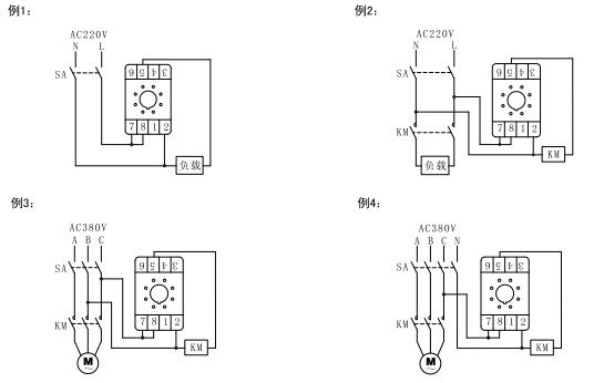 1.单相负载时,若负载阻性电路小于等于3A或感性电流小于等于0.5A,继电器直接控制,接线参考例1;若负载阻性电流大于3A或感性电流大于0.5A,继电器通过交流接触器扩容,接线参考例2;三相负载时,交流接触器和继电器电源为AC380V,接线参考例3;交流接触器和继电器电源为AC220V时,接线参考例4.