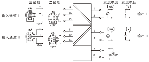给二、三线制变送器提供隔离的电源电压,将变送器产生的直流电流信号经过隔离传送,转换成所需的信号给其它仪表。可以与单元组合仪表及DCS、PLC等系统配套使用,给予现场仪表信号隔离、信号转换、信号分配、信号处理等,从而提高工业生产过程自动控制系统的抗干扰能力,保证系统的稳定性和可靠性。本产品品种分为一进一出、一进二出、二进二出,且输入、输出磁隔离。