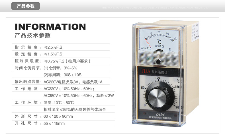 TDA、TDW、TEA、TED、TE、TDB系列电子式温度指示调节仪是本公司生产的新颖自化仪表。产品体积小、重量轻、外形美、可靠性好、抗震动和抗干扰性能强。配热电偶的仪表具有冷端自动补偿功能和断偶自动保护功能。其中TDW系列仪表安装开孔尺寸与XC系列动圈仪表相同,是XC系列动圈式仪表的更新产品。 TEA、TED系列是按国际DIN标准设计,是替代进口仪表的良好选择。本厂产品可广泛应用于烟草机械、塑料机械、橡胶机械、包装机械以及服装、食品冶金、印染等待业作-200oC~1600oC范围的温度测量和自动调节。