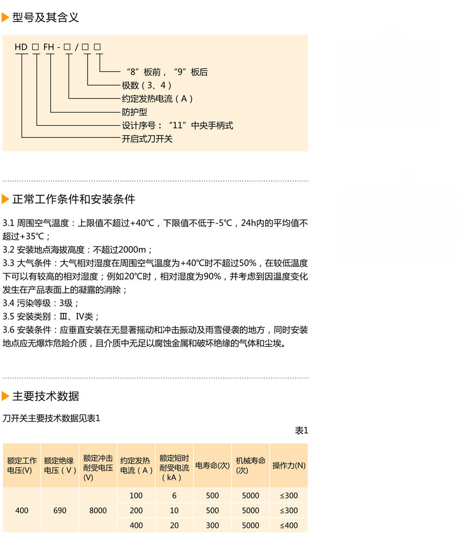 HD11FH系列开启式开关(以下简称刀开关),其额定工作频率为50Hz,额定工作电压交流400V,额定工作电流至400A,在工业企业的配电设备中,用来接通及分断额定电流的交流电路或作隔离开关用。 |