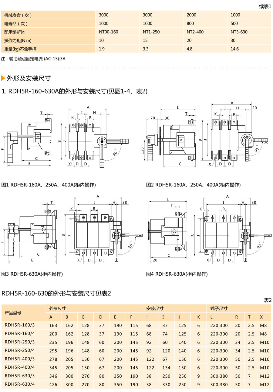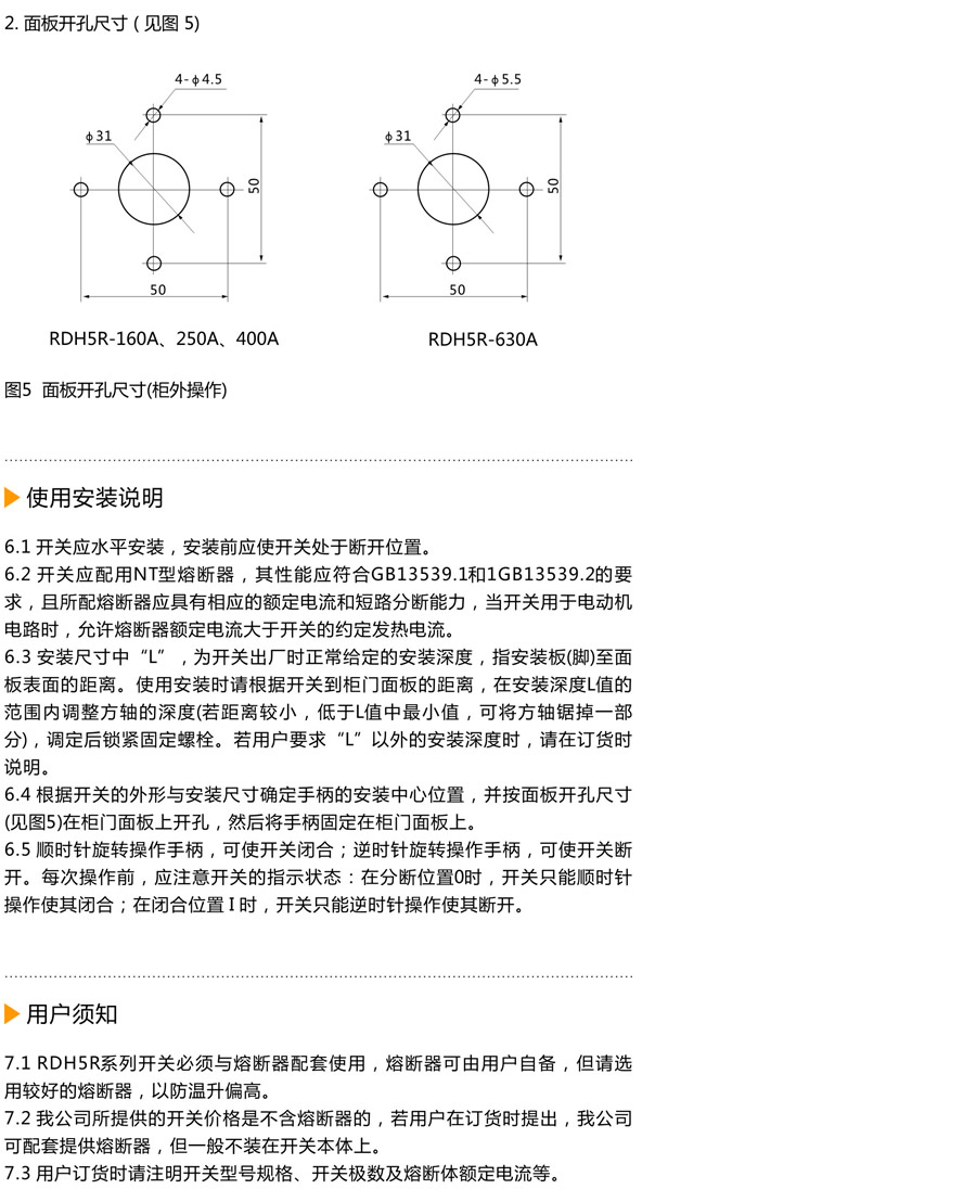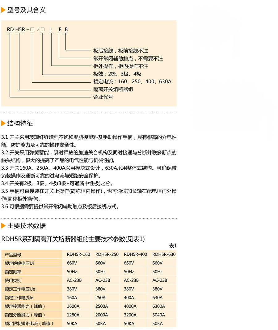 RDH5R系列隔离开关熔断器组(以下简称开关),适用于交流50Hz、额定电压至660V、额定电流至630A的工业配电网中:广泛用于具有高短路电流的配电电路和电动机电路中,用作手动不频繁接通与分断电路或电气隔离之用:可带负荷操作,并作电路短路保护之用。开关造型美观、新颖简洁,并符合IEC 60947-3、GB 14048.3标准。  |