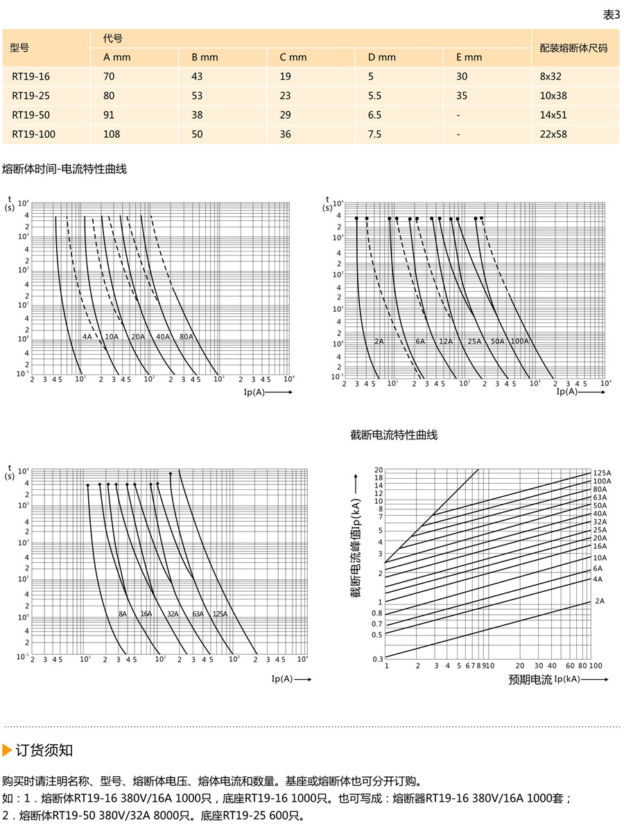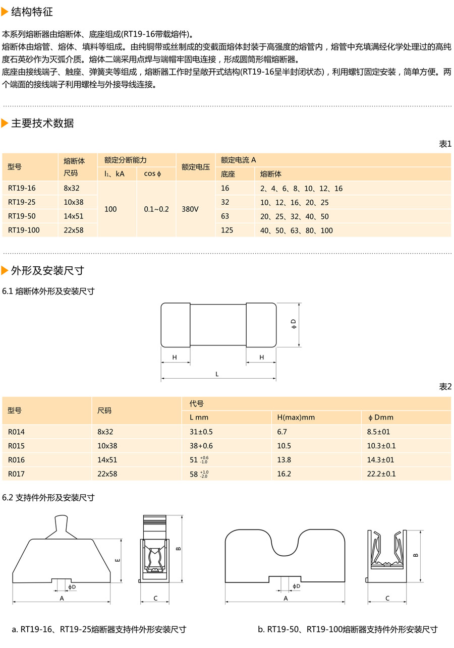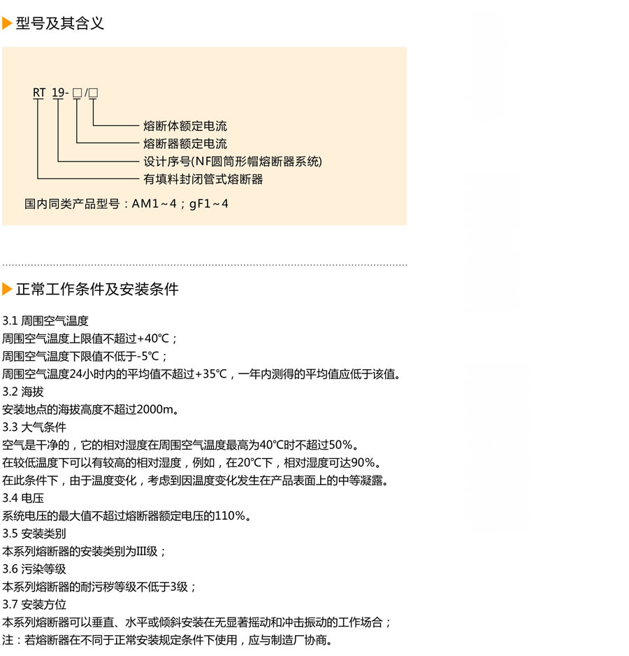 RT19系列有填料封闭管式圆筒形帽熔断器(以下简称熔断器)适用于交流50Hz,额定电压380V,额定电流至125A的工业电气配电装置中,作线路过载和短路保护之用。执行标准GB13539.1-2008/IEC 60269-1:2006;GB/T13539.2-2008/IEC60269-2:2006  |