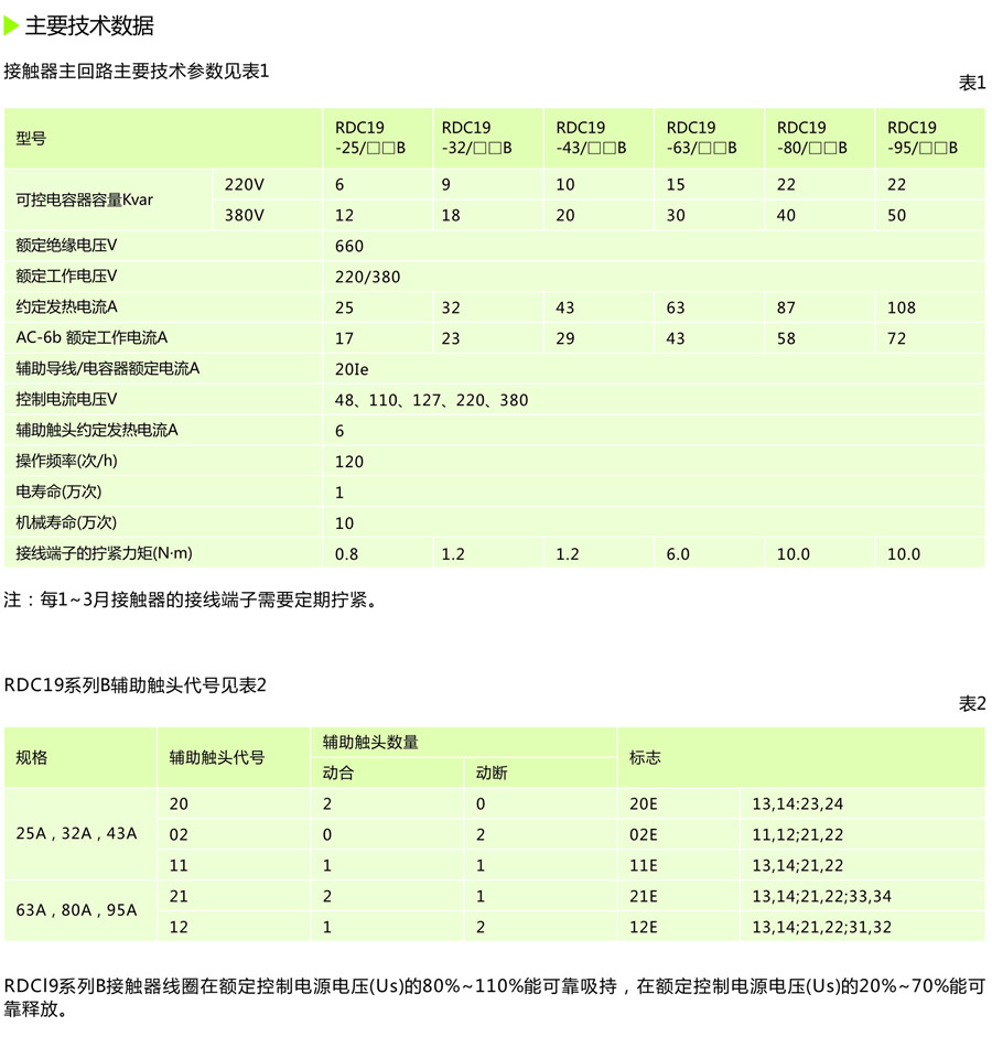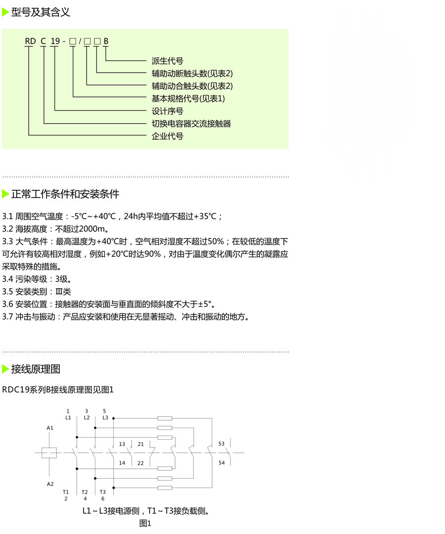 RDC19系列B切切换电容器交流接触器(以下简称接触器),适用于交流50Hz(或60Hz),额定电源电压至660V及以下的电力线路中,供低压无功功率补偿设备投入或切除低压并联电容器之用,接触器附有抑制涌流装置,不用加装限流电抗器就能有效抑制合闸涌流对电容器的冲击和降低开断瞬时的过电压。本产品符合:GB14048.4、IEC60947-4-1 等标准。 |