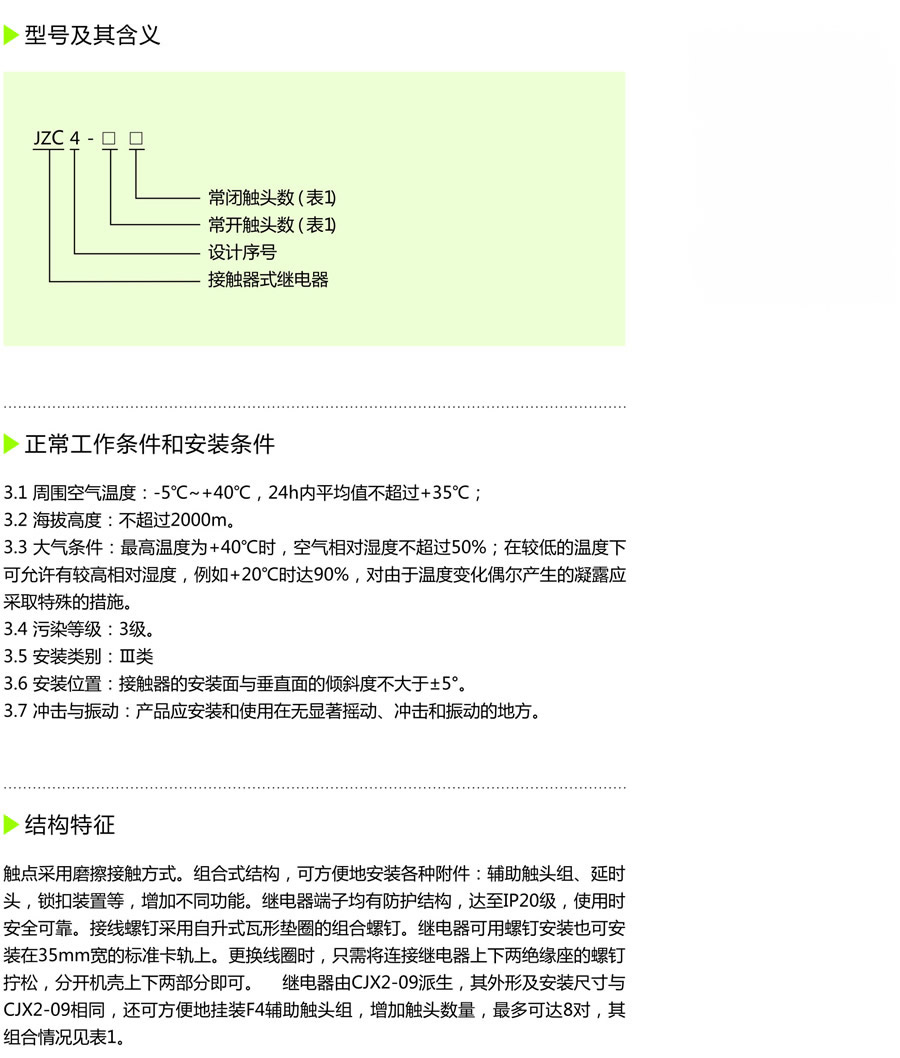 JZC4系列接触器式继电器(以下简称继电器)主要用于交流50Hz或60Hz,额定工作电压至380V及直流额定电压至220V的继电控制、信号传递,信号放大等电路中,作接通、分断、放大之用。 继电器按GB14048.5及JB/T8978等标准设计、制造与检验。本产品符合:GB14048.5、IEC60947-5-1 等标准。 |