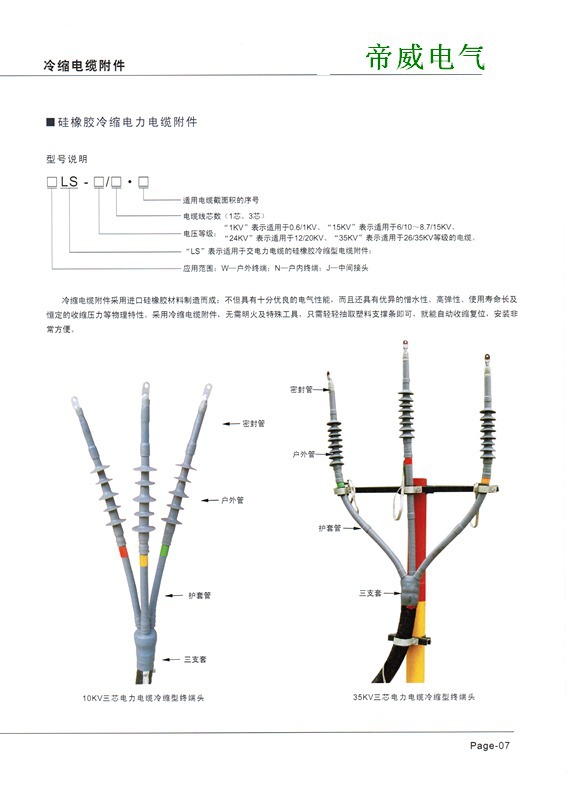 冷缩电缆附件采用进口硅橡胶材料制造而成,不但具有十分优良的电气性能,而且还具有优异的憎水性、高弹性、使用寿命长及恒定的收缩压力等物理特性。采用冷缩电缆附件,无需明火及特殊工具,只要轻轻抽取塑料支撑条即可,就能自动收缩复位,安装非常方便;