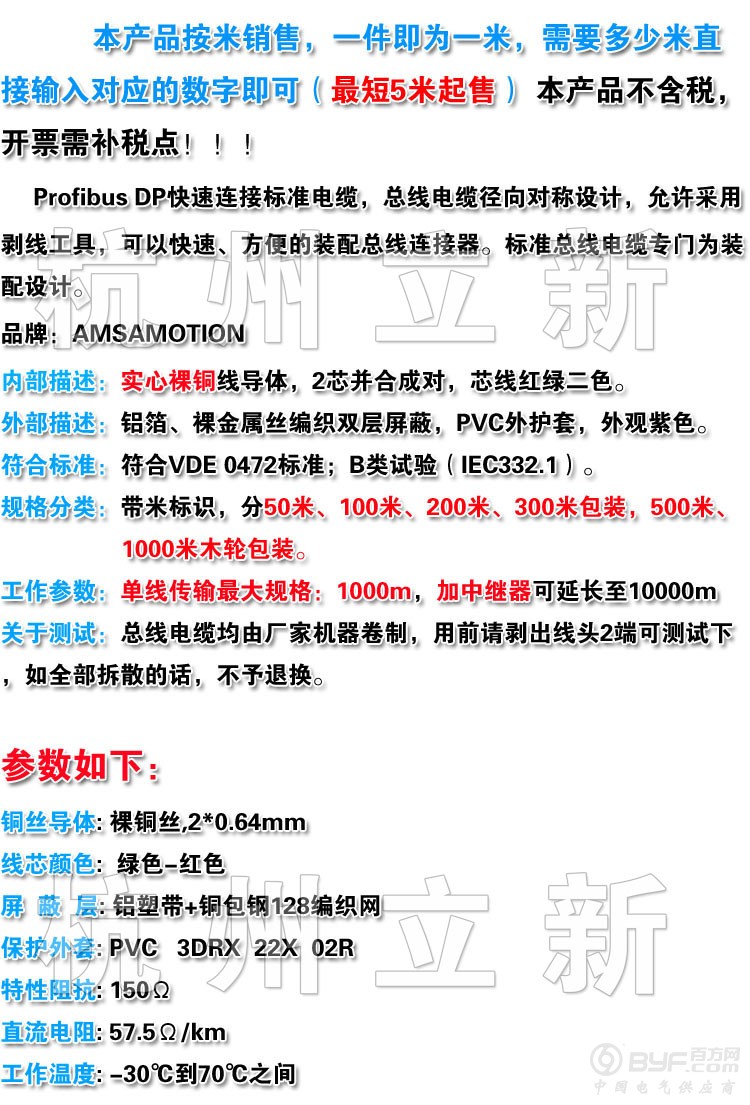 Profibus DP 电缆 采用实心裸铜线导体作芯线,加厚铝箔和加密裸金属丝编织层,屏蔽效果好,紫色PVC外护套。具有良好的信号传输性能。
