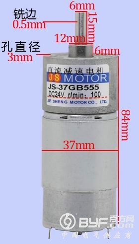JS MOTOR 直流减速电机 JS-37GB555 1.调速精度高.2、变速范围大,输出速比可在1:3至1:1800之间变化;3、强度高,寿命长。4、调速方便。5、可连续工作运转,且可正反方向运转,运转平稳,性能稳定,噪音低。