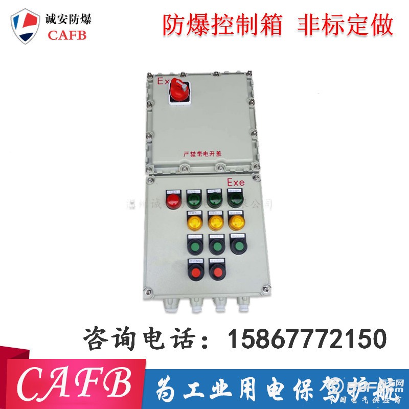 三相防爆控制箱 控制进料泵油泵防爆配电箱按电气接线要求将开关设备、测量仪表、保护电器和辅助设备组装在封闭或半封闭金属柜中或屏幅上,构成低压配电装置。正常运行时可借助手动或自动开关接通或分断电路。故障或不正常运行时借助保护电器切断电路或报警。借测量仪表可显示运行中的各种参数,还可对某些电气参数进行调整,对偏离正常工作状态进行提示或发出信号。常用于各发、配、变电所中。