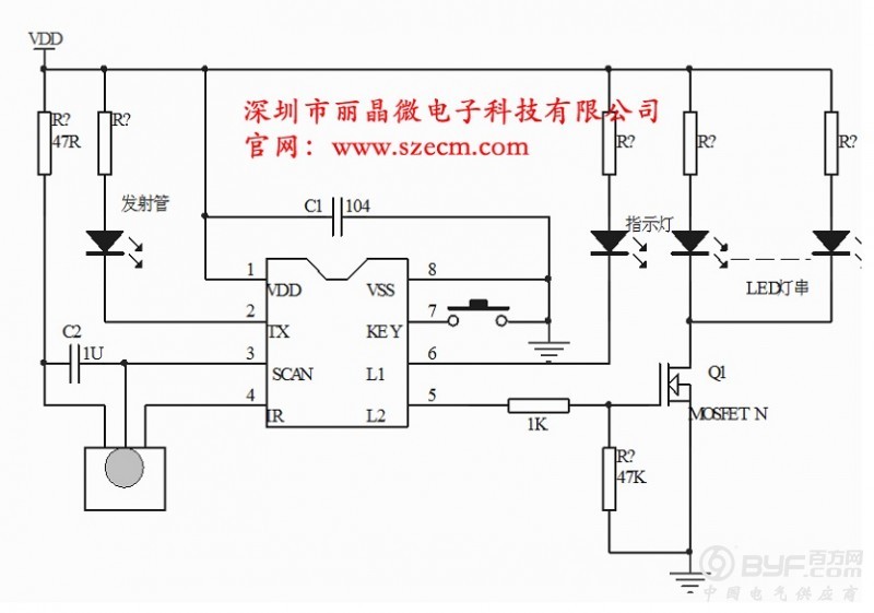 2、两路LED输出,一路作红外指示灯L1,一路输出高电平推灯串L2。