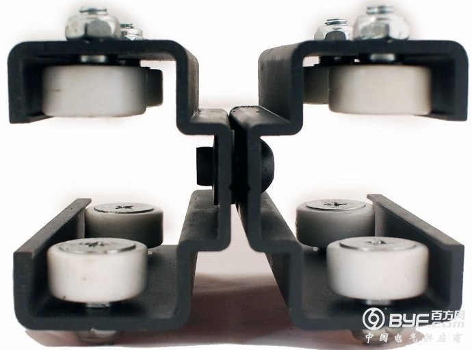 双滑轮 双滑轮用于天花路轨上轨道的连接,以便于轨道之间自由滑动 。