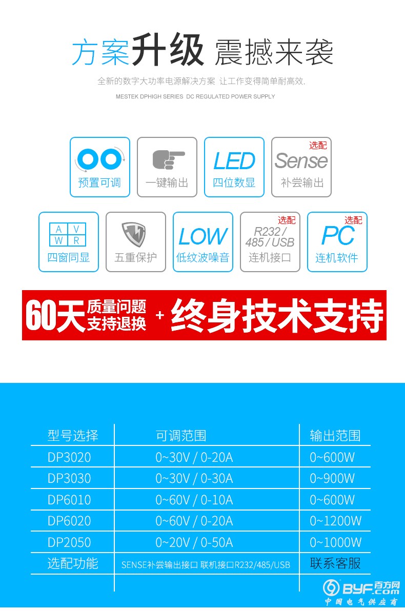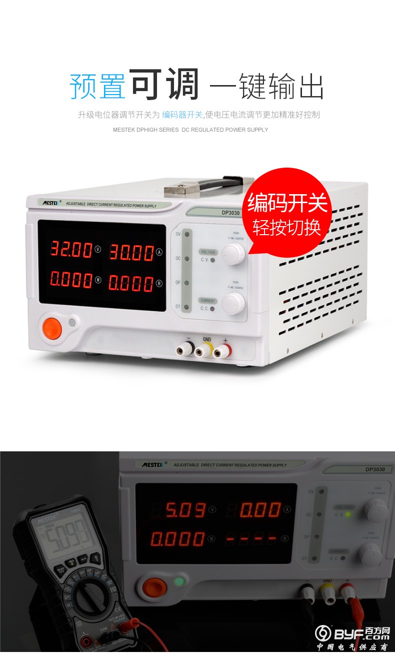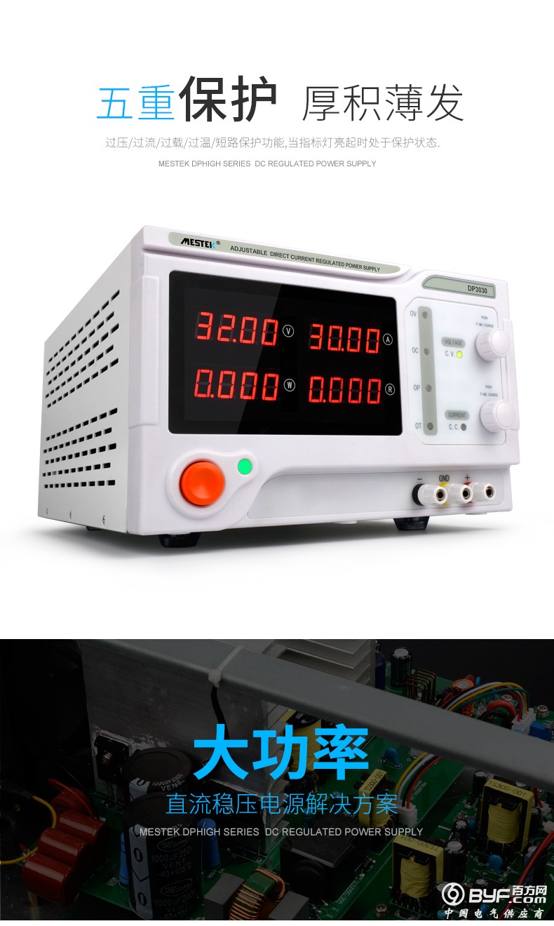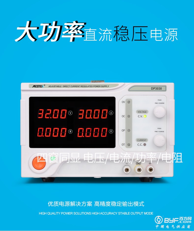 MESTEK大功率可调直流稳压电源,预置可调,一键输出,四位显示,四窗同显,低纹波噪音,产品设计均符合国际电工委员会安全标准,并获得欧盟新CE-EMC/LCD、ROHS、REACH等相关认证,公司严格的质量管理体系和完善的为全球客户提供优质合格的产品。
