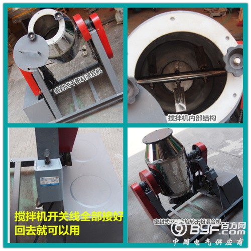 搅拌机360度旋转,翻转,搅拌机半中间有搅拌叶片。搅拌机运转的时候搅拌叶片同时转动,旋转的双锥筒使筒体内物料产生紊乱翻滚混合,高速旋转的搅拌叶片打碎结团物料,使物料在筒体内快速混合。